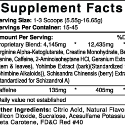 Pré-treino ultra concentrado com 2-aminoisoheptano (DMHA), cafeína e ioimbina para estímulo central intenso, foco e termogênese. Inclui extrato de gerânio para energia agressiva, beta-alanina para resistência e creatina para força. Arginina AKG amplia o pump, enquanto Schisandra chinensis contribui para desempenho e resistência mental em treinos extremos.